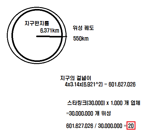 이 넓이에 스타링크 같은 위성들이 일정 간격으로 들어간다고 생각해보자