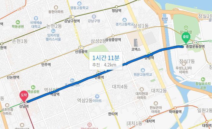 강남역에서 로켓이 지나갈 때, 종합운동장역에 위성이 있는 거니까 엄청멀다.