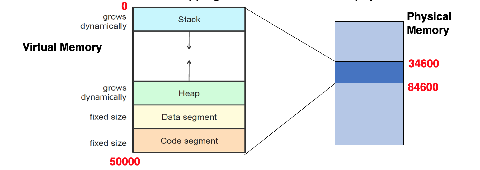 가상 메모리는 physical memory의 주소값을 갖는 형태로, 프로세스별로 각각 독립된 가상 메모리 공간을 가지면 physical memory에 가상 메모리에 담긴 주소값으로 접근하는 것이다. Virtual Memory -> Physical Memery 로의 전환은 MMU(Memory-Management-Unit)이 담당하며, 런타임에 매핑된다