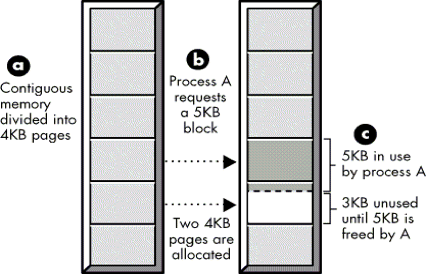4KB의 page를 설정했고 process A가 5kb의 메모리 영역이 필요하다. 이때 page가 2개가 필요해진다. (4KB + 1KB) 문제는 1KB영역에 페이지는 3KB가 남아버린다..