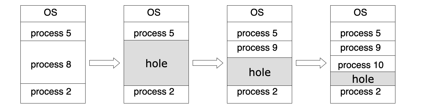 문제는 이런식으로 프로세스 공간을 제공하다보면 release된 메모리들에게 hole이 발생하고, 이 부분을 채워주지 않는다면 메모리가 낭비된다. 위 그림의 경우 process 10의 공간이 hole보다 작았기에 쓸 수 있던 것이지, 만약 hole의 공간보다 메모리 영역이 컸다면 공간이 없다고 OS는 판단할 것이다.