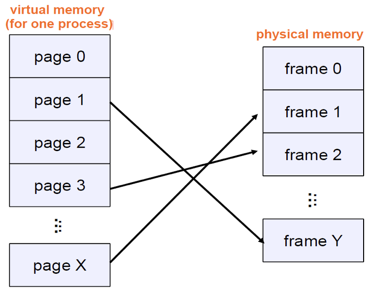 페이징은 Virtual Memory는 같은 크기의 page로 분할하고, Physical Memory에는 같은 크기의 frame으로 잘게 나누는 것이다. 즉 기존의 방법은 연속적 공간을 가져갔다면, 이제는 Physical Memory의 비연속적인 공간을 가져가는 것이다. 띄엄띄엄!