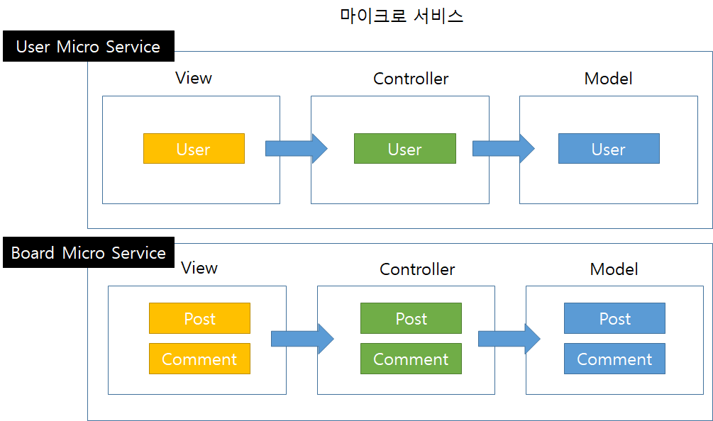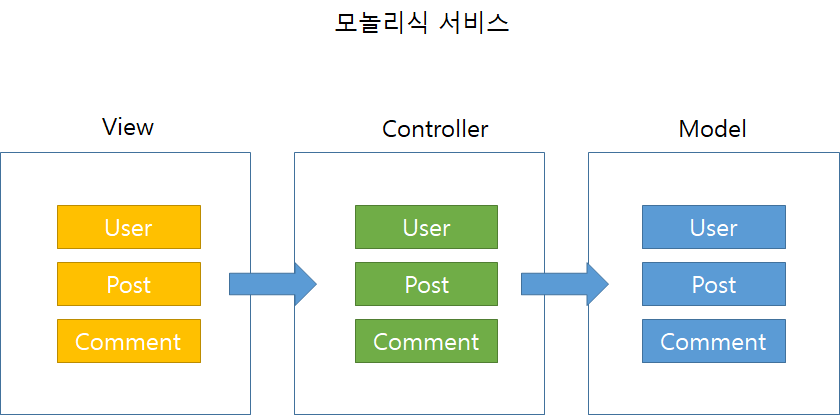 현재 서비스 아키텍쳐이다. 모놀리식 서비스에 MVC 패턴을 적용해왔다. 유저와 게시판을 구성한다고 가정하면 User/Post/Comment 라는 Model(테이블)이 있을 것이고, 이에 해당하며 로직을 담당하는 Controller 가 존재한다.