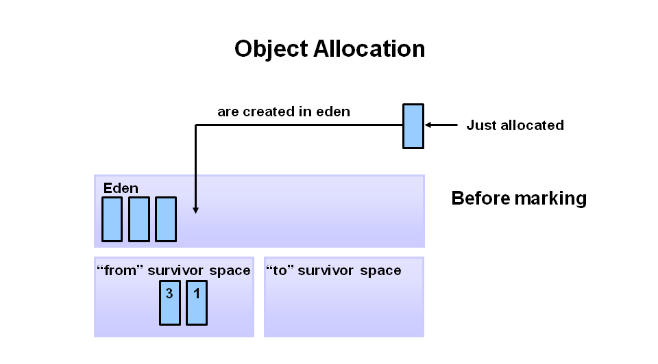 1. First, any new objects are allocated to the eden space. Both survivor spaces start out empty.