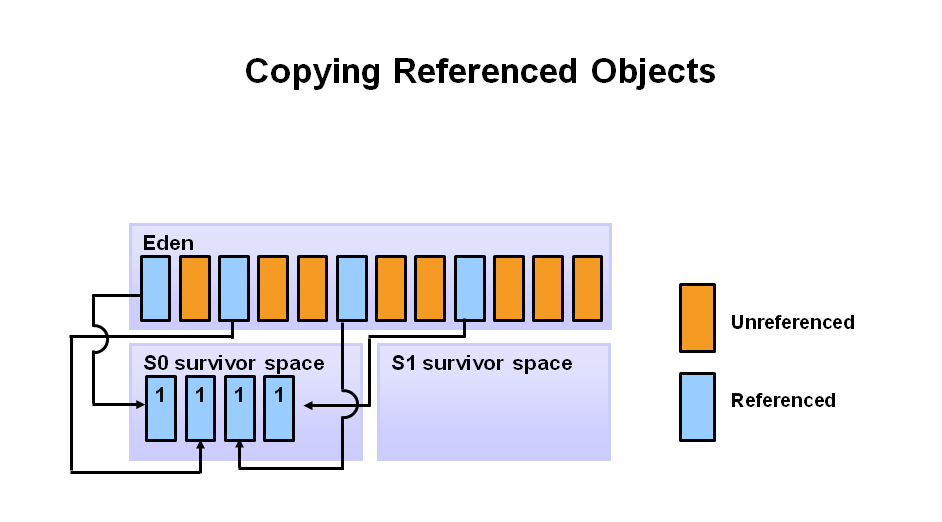3. Referenced objects are moved to the first survivor space. Unreferenced objects are deleted when the eden space is cleared.